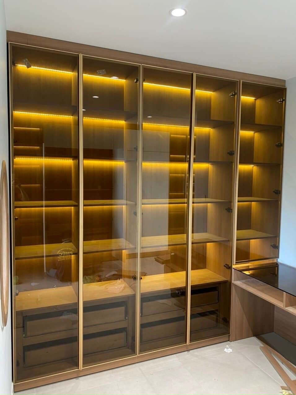 Tủ nhôm cánh kính đen tạo điểm nhấn cho không gian, phù hợp với những ai yêu thích phong cách tối giản hoặc muốn tạo sự tương phản trong thiết kế nội thất.